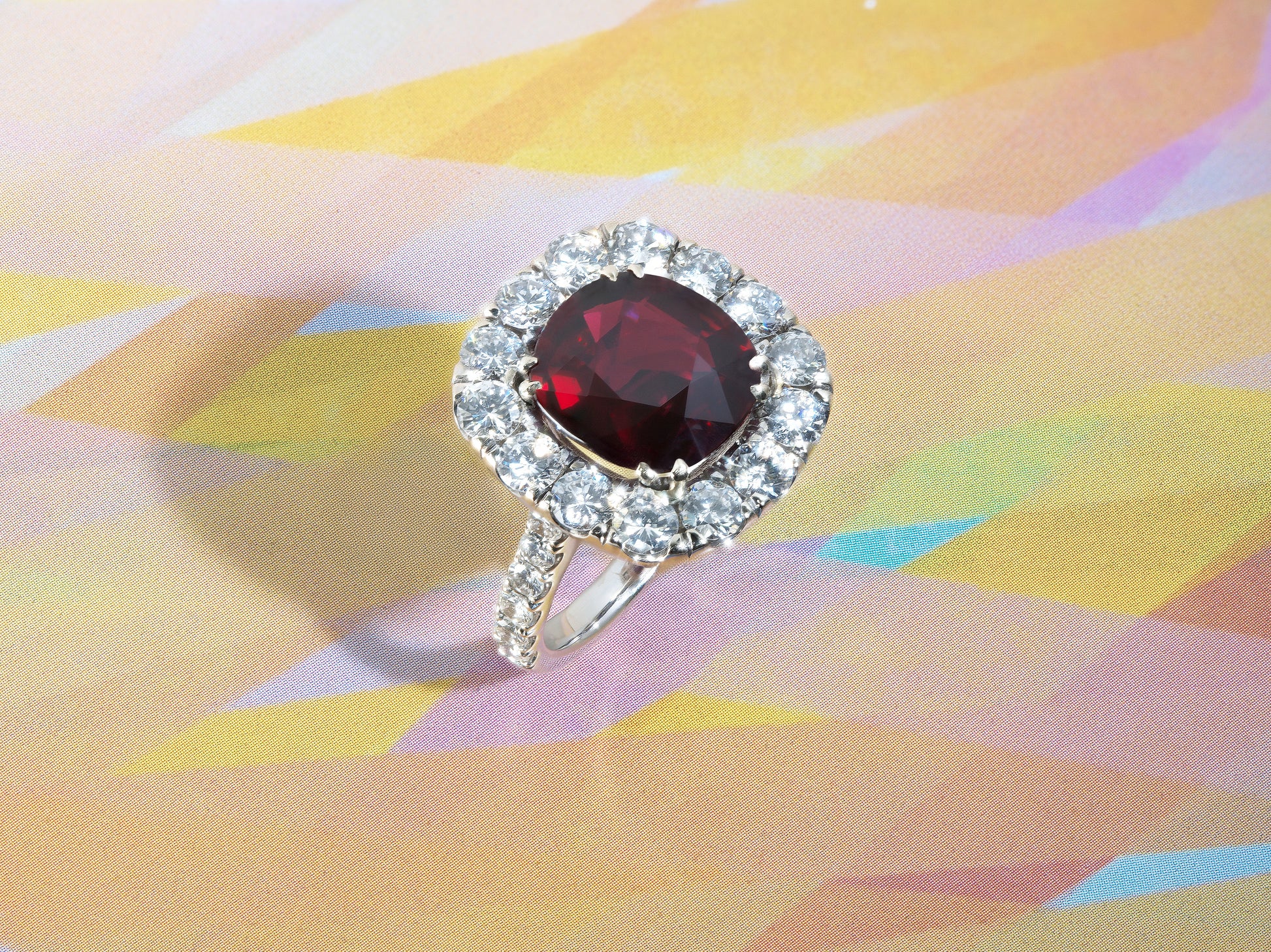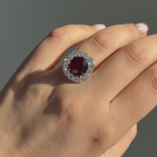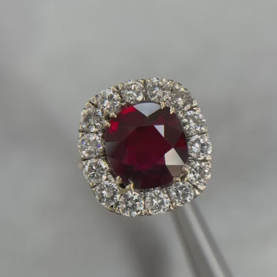 5.06 ct. Cushion Ruby Red Mozambique No Heat Ring GRS w Dia Halo 2.34CTW 26 Dia