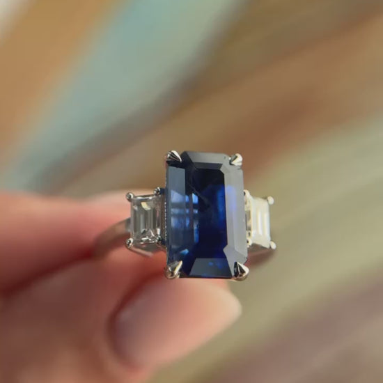 5.46ct. Sapphire Ring, Ceylon, Heated (GIA) with approximately 0.66ctw emerald cut diamond side stones in estate ring.